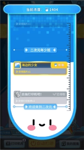 2、每打印完一行,就能获取一定量的二次元液体并存入顶部的浓度杯中,当浓度达标后还能解锁额外奖励。