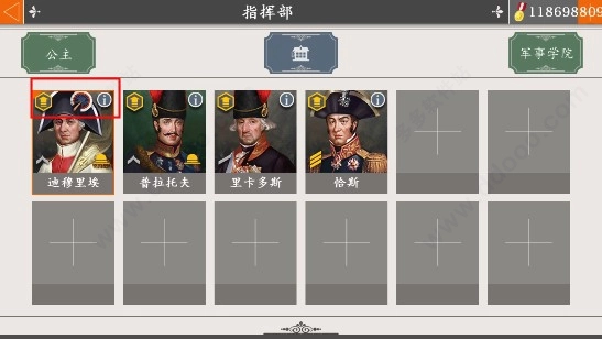 2、点击“指挥部”,能够查看当前已拥有的将领列表。其中空槽代表还未招募将领。点击右上角的“军事学院”,就可以浏览能够招募的将领名单。