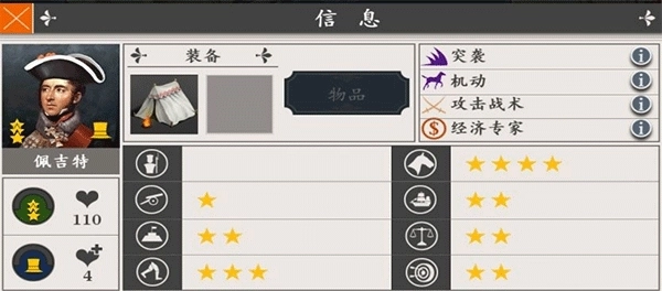 18世纪末到19世纪初,英国将领佩吉特在军政两界都十分活跃。他担任4星骑兵指挥,掌握着“突袭”“机动”“攻击战术”与“经济专家”这几项技能。其中“机动”技能能大幅增加骑兵的移动范围,让部队在追击和包抄行动中具备强大威慑力,成为战场上快速应对局势的关键力量。