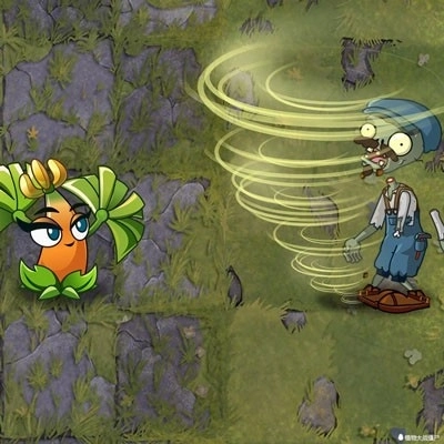 芭蕉奋力挥动叶片,卷起一股巨大的龙卷风,精准命中最前方的僵尸并造成高额伤害。龙卷风消散后,原地留下一片持续产生吸力的旋风区域,将周围3×3范围内的敌人不断吸入其中并持续攻击。