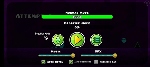 这里提供了多种游戏模式,除了核心的"Cube"模式外,还有"Ship"、"Ball"和"UFO"等特殊模式。每种模式都具备独特的操作方式与挑战内容。