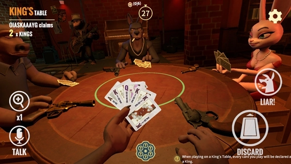 4、玩家进入游戏后需轮流进行出牌操作,并同时声明所出牌的牌面数值。该数值必须符合桌面上的要求(如“国王”“皇后”等)。