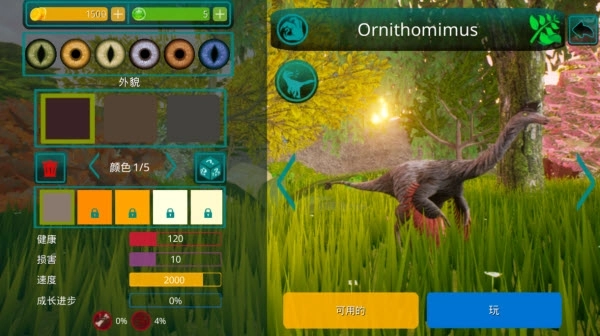 1、启动游戏后,首先会进入角色选择界面,你可以从中挑选自己喜欢的恐龙种类,点击“玩”按钮就能进入史前世界,开启这段冒险之旅。