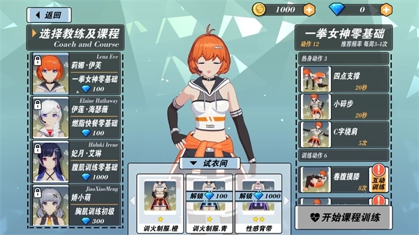 2、其中游戏玩法也十分简单,每位教练都有各自不同的训练计划目标,像莉娜伊芙就具备12种训练方式,里面涵盖3个热身项目、6个训练课程,另外还有3个放松计划。