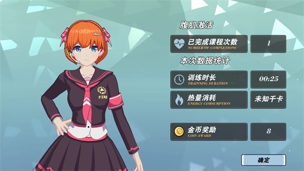 7、训练结束后能查看本次训练的数据统计,里面包含训练时长和热量消耗,而且还能获得金币奖励呢!