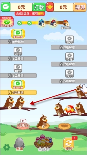2、当同一树梢上聚集了三只相同的小鸟时,它们会自动合成,解锁新的小鸟种类,同时你还能获得红包奖励。