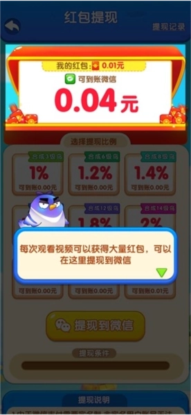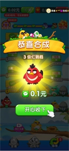 3、合成高等级的小鸟即可领取红包,不同等级的小鸟对应的红包金额存在差异,等级越高,所能获得的红包就越多。
