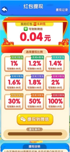 5、游戏初始的兑换比例设定为1%,若能合成出更高等级的小鸟,便可提升该兑换比例。