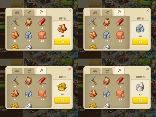 2、矿石的获取途径主要有三种:自行挖掘、向商人购买以及向社团成员求助。部分玩家更愿意直接购买矿石来节省时间,但要留意商人每日的供应量是有限的:铜矿石或银矿石最多供应13个,金矿石或铂金矿石最多供应9个。