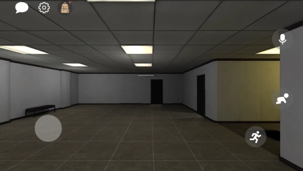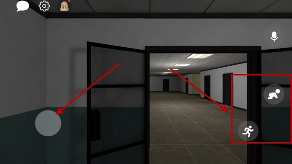 5、正式进入场景后,角色移动由左侧虚拟摇杆操控,右下角的两个按钮分别负责“蹲下”和“冲刺”功能,能更灵活地应对突发状况。