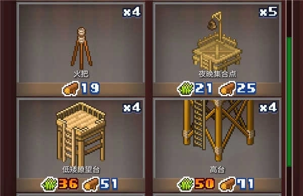 低矮瞭望台:需配备49枚以上大钉子,以及5550枚以上铜币。