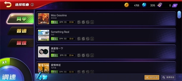 每种模式下都设有简单、普通和困难三类关卡供选择,同时可在一至八级的范围内挑选从简单到困难的歌曲速度。若要解锁普通歌曲,需在简单模式中获得A级评价;而解锁困难歌曲,则要求简单和普通歌曲均取得A级评价。