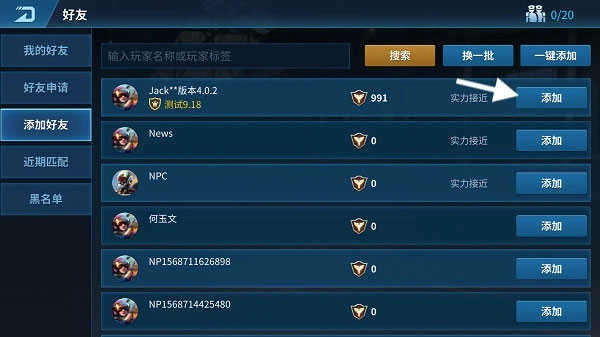 3、添加好友:进入添加好友页签后,系统会自动推荐部分玩家,玩家可点击申请按钮发起好友申请,也能在输入栏输入玩家标签或名字来搜索并添加好友;