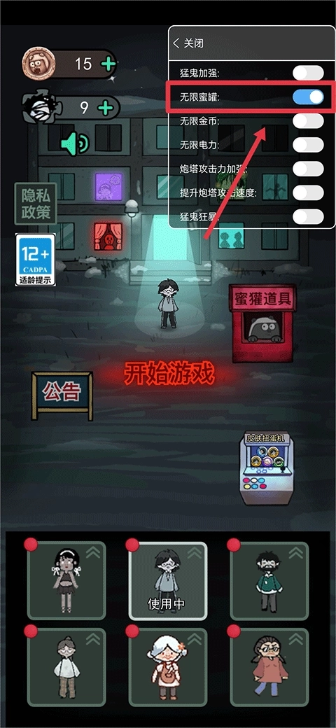 1、前往蜜罐商店选购道具时,黑科技分类下的维修台和能量罩是必买项,二者搭配使用能让维修台的效果提升50%;其余道具可根据关卡需求按需购买。另外要留意,商城里通过观看视频能获取房门升级卡,还有修勾魔盒——它既能在剧情中随机变成一种道具使用,也可用于免费升级炮塔。
