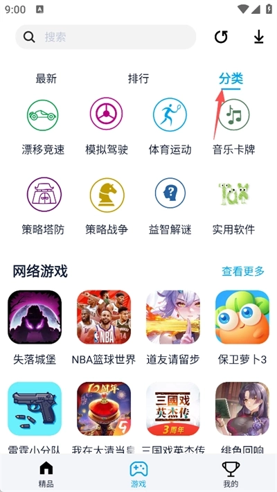点击下方的游戏栏目,在该界面选择分类,即可查询到各类游戏。