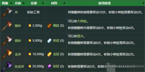 每提升一级,砍树的次数就会减少2次,砍树桩的次数则会减少1次。