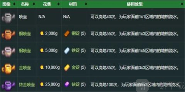 它能用来浇灌作物,各类水都可以装入其中,也能汲取井水。要是一天没给作物浇水,它们的生长就会变慢,严重时甚至会枯萎。不过要是遇到下雨天,就不用再给作物浇水了。