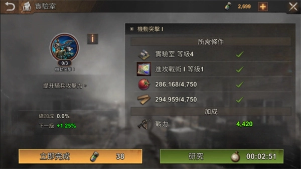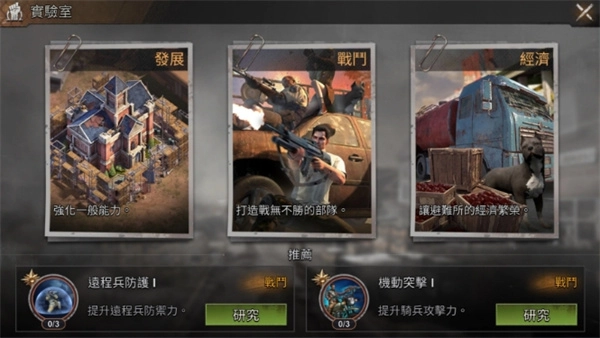 消耗一定量的资源(包括粮食、木材、金属和汽油)后,玩家就能研发并升级特定科技。每个科技都有不同的等级上限,并且多数情况下,玩家需要先掌握某一科技,才能解锁其他相关科技。此外,玩家可研发的科技还会受到实验室等级的限制。科技研发需要耗费一定时间才能完成,不过玩家可以通过使用研发加速道具或抗丧宁来提升研发速度。另外,在盟友的协助下,玩家也能缩短科技研发的时间,但获得帮助的次数以及可缩短的研发时间均存在限制。