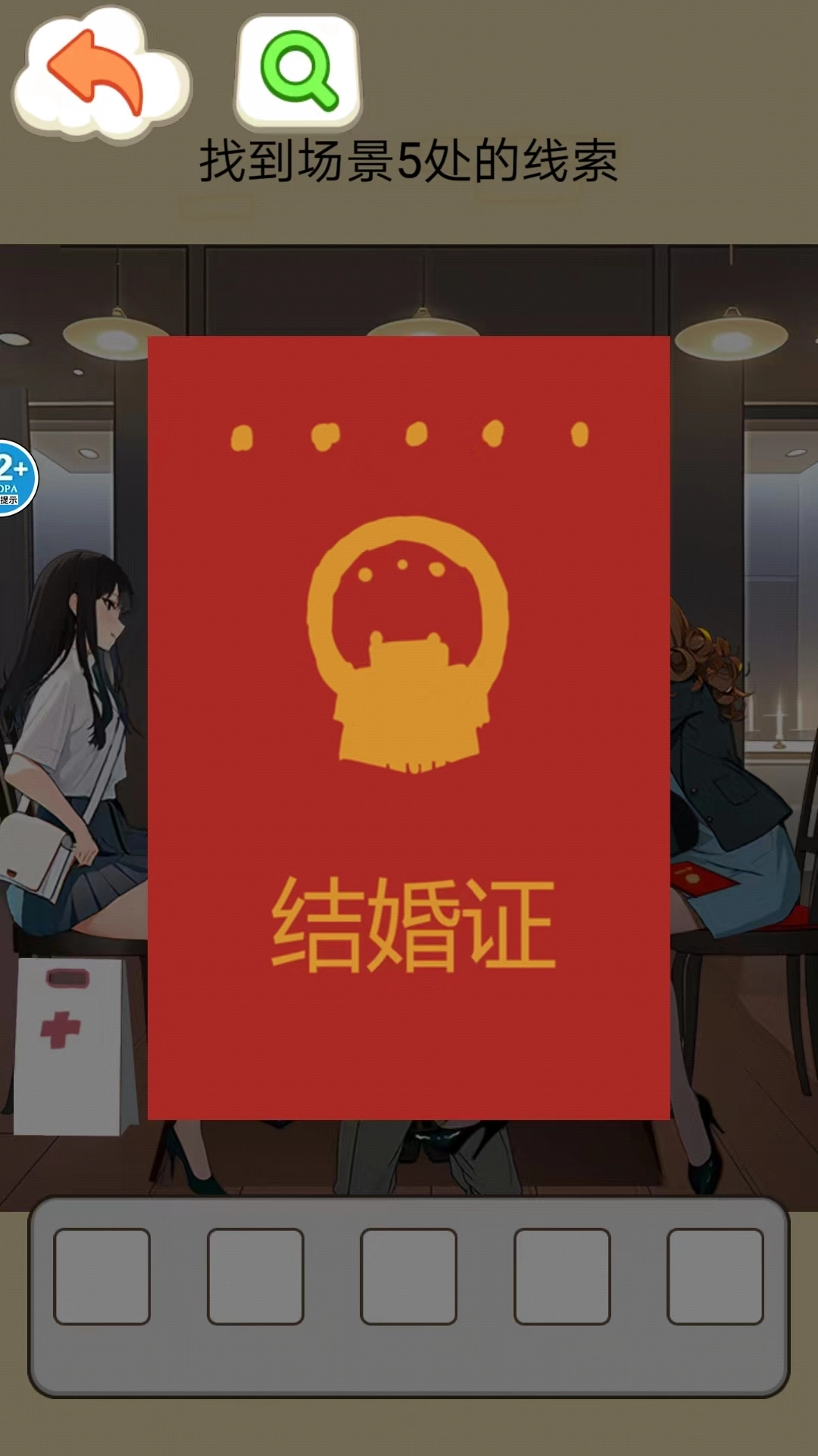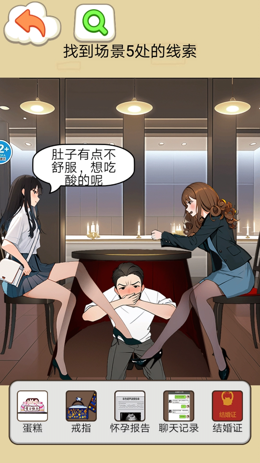 点击女主角腿部的结婚证书图标,每当找到正确的线索时,就会触发剧情对话。