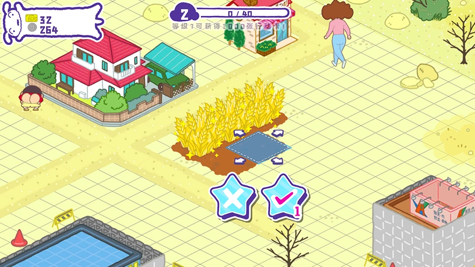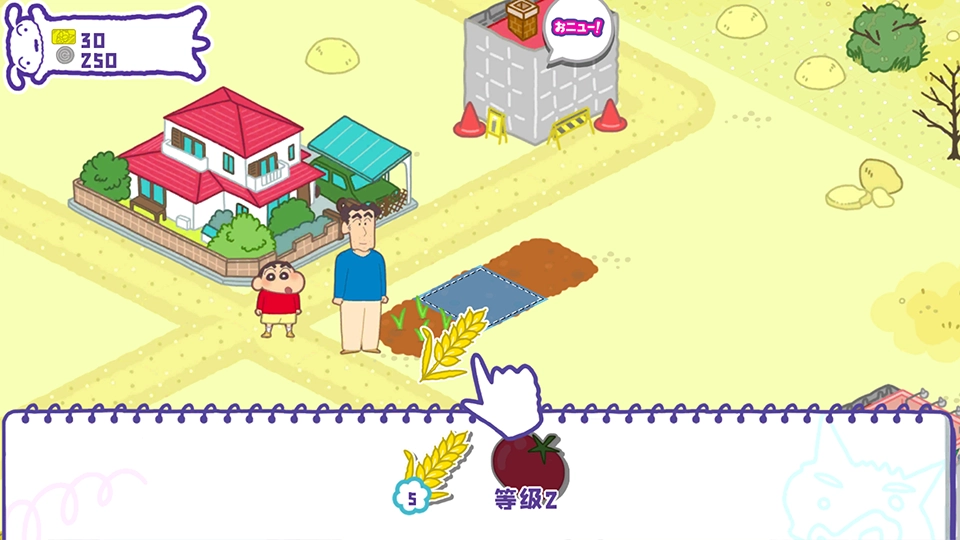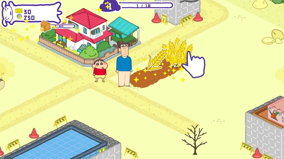 为了建设春日部,我们得靠种植农作物来盈利,点击就能收获小麦,再次点击土地就能重新播种。