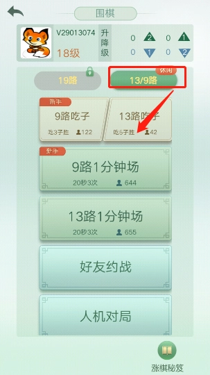 当前版本包含围棋、九路飞刀与死活题三种玩法,首次进入游戏的玩家在“围棋”模式中仅能体验13路和9路的对局
