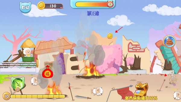 核心玩法是点击敌人,懒羊羊就会自动瞄准并射出弓箭攻击目标,击倒敌人后就能继续前进。