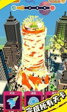挑战各种强度的障碍物,创造出威力更强的龙卷风,尽情享受摧毁一切的快感。