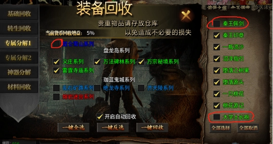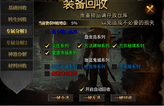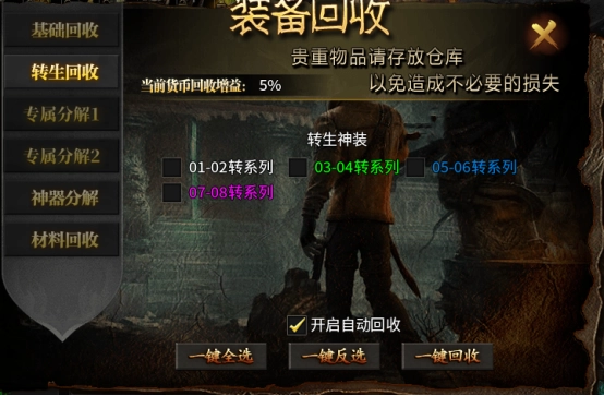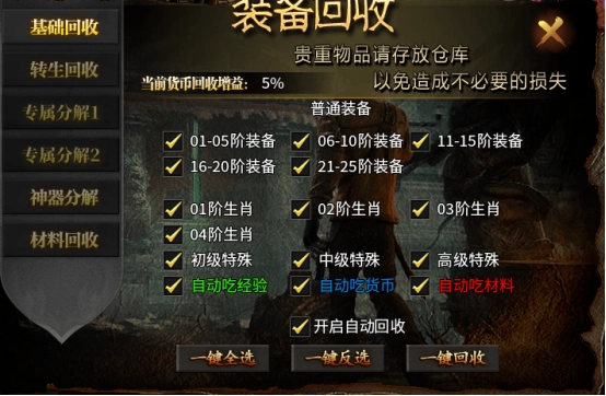 回收前请仔细确认装备,避免误回收仍有用处的装备。开启自动回收功能时,务必设置好合理的回收条件,以防将有价值的装备误回收。