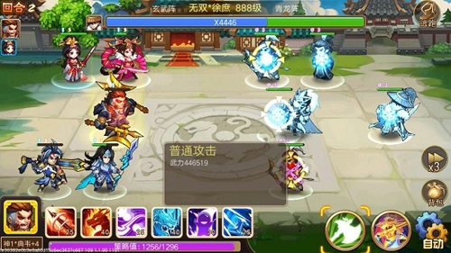 第二回合。第二回合为加速、减速和进攻回合。本回合,邓艾、赵云、大乔都有大招。邓艾一速放大,貂蝉二速给典韦杜康酒,赵云三速放大招,典韦输出放技能打最上面的弓手和谋士,大乔放大招。有个小技巧,记住:奇数回合为控制回合、偶数回合为加减速、攻击回合(当然如果你四星赵云邓艾不同)。