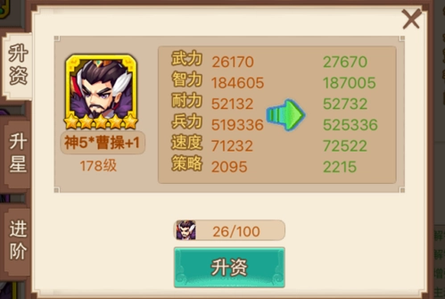 1,升资。利用武将升阶石对武将进行升资,每次升资能一定幅度提升武将的六围属性,紫色最高五阶,从+0升资到+5依次需要20、40、80、120、160个武将升阶石,共计620个。当武将资质达到+5时,花费200个武将升阶石可以进行品质升华,由紫色武将变成金色武将。金色武将升资从+0到+5依次需要50、100、200、300、400个武将升阶石,共计1050个。目前版本武将升资最高是金色+5。(升阶石来源请看资源篇)如图: