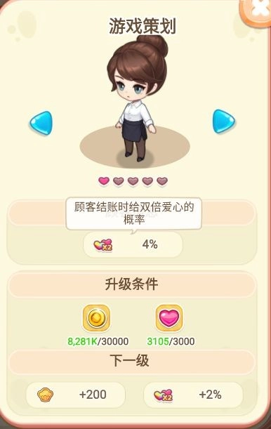再升级【游戏策划】与【部门经理】。这2位【顾客】是增加给了爱心之后,翻倍的概率。