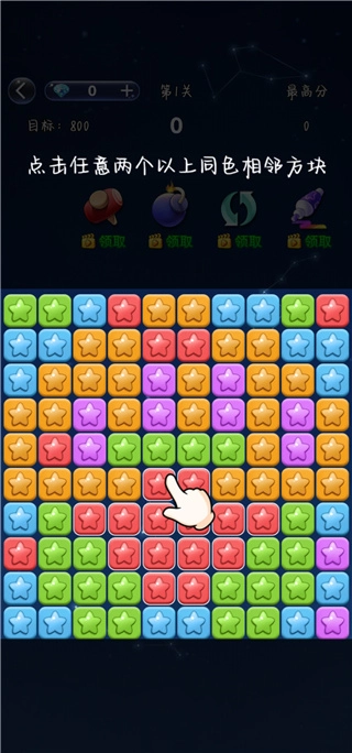 点击两颗或更多相邻的同色星星就能消除,游戏没有关卡限制,玩家可以尽情享受消除带来的乐趣。