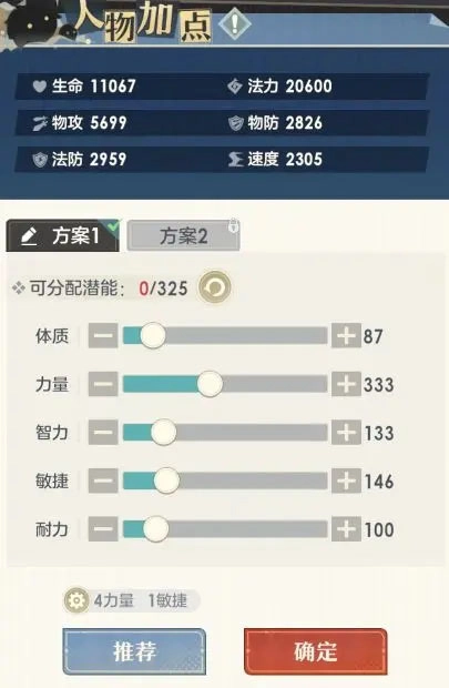 目前游戏内剑歌的推荐加点方案都是以力量为主。这里也推荐4力1敏,或者5力的输出流,这种加点方式可以适用于大部分桃花师,可面向的战斗场景也比较广。当然目前也有很多桃花师根据自身资源情况定制其他方案,例如我也试过2力量2耐力1体质,配合三级金(命魂20个金属性)提升攻击,能保障输出和肉,但所需资源量要求会更高。大家可以根据自身情况多试验,选择最合适自己的方案。