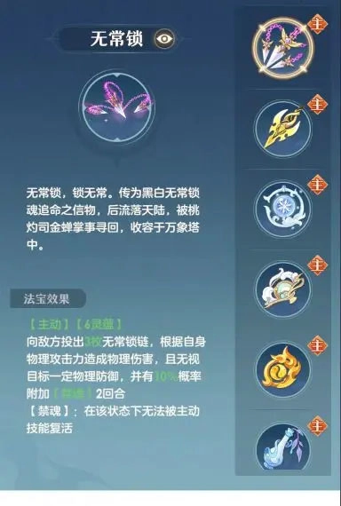 法宝方面,剑歌强推携带无常锁,可造成无视物理防御的物理伤害,并且有概率禁魂,防止敌人被主动技能复活。其次推荐主动雪灵珠,被动凌云剑、神行令、修罗环,可以提升队伍稳定性和自身的伤害。