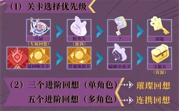 人物养成共分三个维度:人物等级(上限),回响等级,灵装(圣遗物)。推荐把常拿回想角色的回响等级都至少升到三级,三级回想等级会解锁该梦灵的璀璨回响。