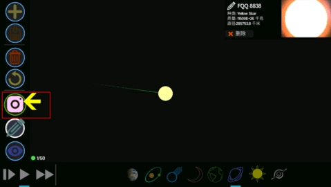 接下来我们要生成一颗环绕你选定恒星转动的行星。请选用绘制气态行星的专用笔刷,接着用手指在操作界面滑动,描绘一条距离恒星较近的轨迹。行星会在该轨迹的起点处生成,而它最初的环绕速度将由这条轨迹的走向来确定。
