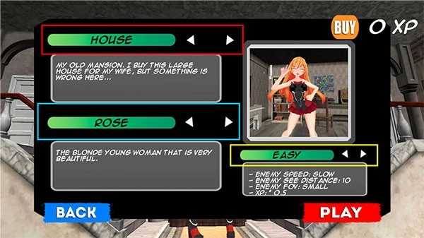 进入游戏后,界面呈现如图所示:红框标注的“house”按钮用于切换场景地图,黄框的“easy”选项可调整游戏难度,蓝框的“rose”功能能切换妻子的不同形象。完成各项设定后,点击“PLAY”即可开始游戏。