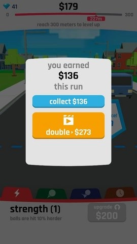 期间你可以升级力量,提升技巧来获得更远的击球距离,在人物的底部有红、绿、蓝和橙色的不同升级方式。