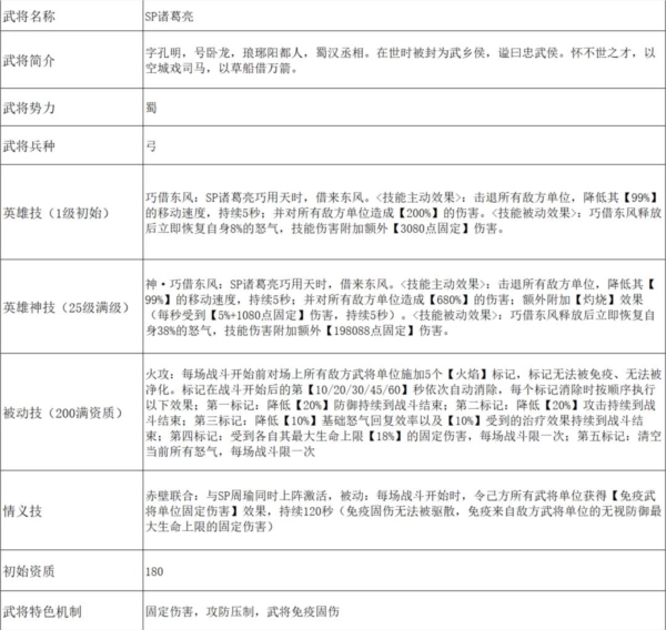 ②被动技能的火焰标记从攻防、怒气、回复、伤害等多个维度对敌军形成压制,凸显出诸葛丞相运筹帷幄的特质;情谊技触发后,SP诸葛亮能够免疫武将单位造成的固定伤害(魔龙、水怪、世界BOSS等非武将单位所造成的固定伤害仍会生效)