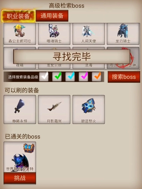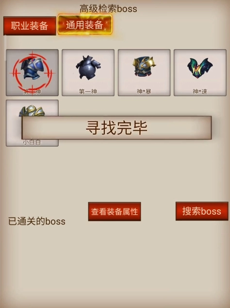 关于挂机:游戏界面有挂机模式和选择boss选项,挂机模式就不介绍了打字累,选择boss可以让你快速选择你想要挂装备的boss(选择boss-点击这里-职业/通用装备然后选择你想挂的装备点击搜索boss,需要注意的是只能搜索你击杀过的)如果你发现正在打的怪不出装备,检查一下该怪的掉落(boss血条最左侧点击宝箱可以查看掉落)没有问题就退游戏清后台一分钟左右在上线百分百会有装备。ps:游戏切换到后台会暂停没有收益,离线掉落远远高于在线,看过广告后会自动进入离线模式,切记挂机时请选择自己能秒的怪切换到重复挑战模式。