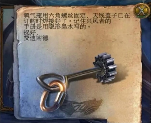 这把钥匙上有不少齿轮,看起来应该和帐篷里柜子的形状相契合;说明书讲的是氧气瓶的开启方法,氧气瓶是用六角螺丝固定的,得用扳手才能打开。
