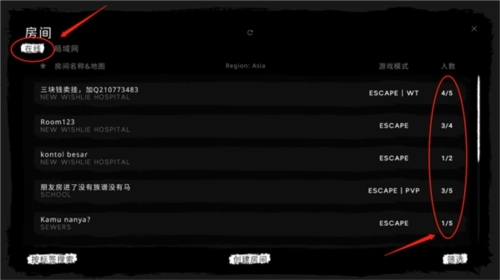 在【房间】界面里,我们能看到其他玩家创建的各类房间,只要点击其中任意一个房间,就能和其他游戏玩家一起畅快游玩。
