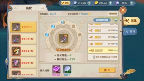 4、第二步是装备强化。每次强化都得用到龙晶强化石和银叶子,而且强化的格数是随机的。就算装备更新换代了,强化等级还是能继承的!要是强化度和完美度达到了特定标准,强化目标进阶之后,就能让属性和战力得到提升。