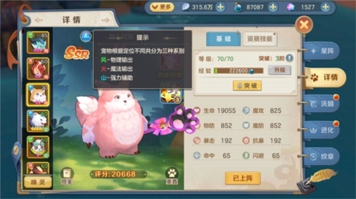 3、?随着等级逐步解锁,宠物星阵系统也会同步开启。一人携带三只宠物的心愿终于能实现啦!三只宠物可以轮流上阵,自由切换,这不就是“四打一”的强势阵容嘛~~对了,大家有没有留意宠物左上角的小标识?每只宠物都自带专属属性,依据不同定位共分为三种系别:风系对应物理输出、火系对应魔法输出、山系则是强力辅助担当。