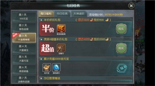 1、七日任务中的今夕任务务必全部完成,以便领取该任务内的超值奖励。