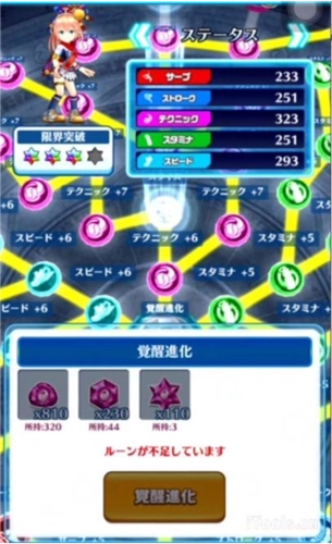 编队界面也和白猫的相似。需要说明的是,白猫网球里的角色没有亲密系统,所以要觉醒角色的话,得点击角色中间的觉醒进化按钮。
