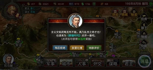 在群雄逐鹿的时代背景下,这款单机军政题材的佳作采用经典战棋玩法,内含30个单机剧本、49张战场地图与8个经典战役。它借鉴并学习了《三国志》《霸王的大陆》系列的设计思路,内容充实且极具耐玩性,玩家上手后很容易沉浸其中。