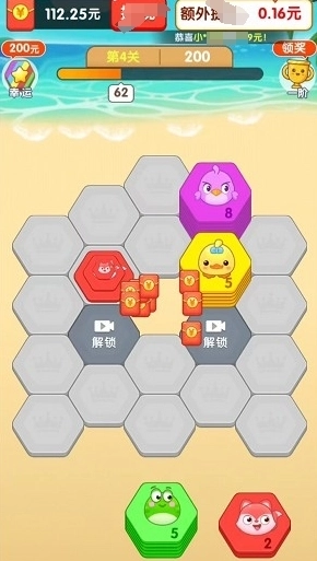 1、通过滑动屏幕堆叠更多六边形方块,持续合成数值更大的方块,以此解锁更多红包。