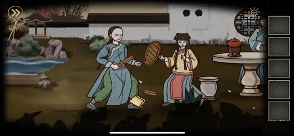 3、桌上恰好放着炉子、茶壶、茶杯和一块木板,炉子里面是空的。接下来需要找到散落在地面的四块木材,再从哥哥身上取出火折子,用木材生火将水烧开,最后把开水倒进哥哥嘴里。