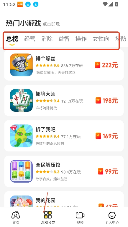 2、进入分类,可以查看游戏类型,根据游戏分类进行游戏筛选